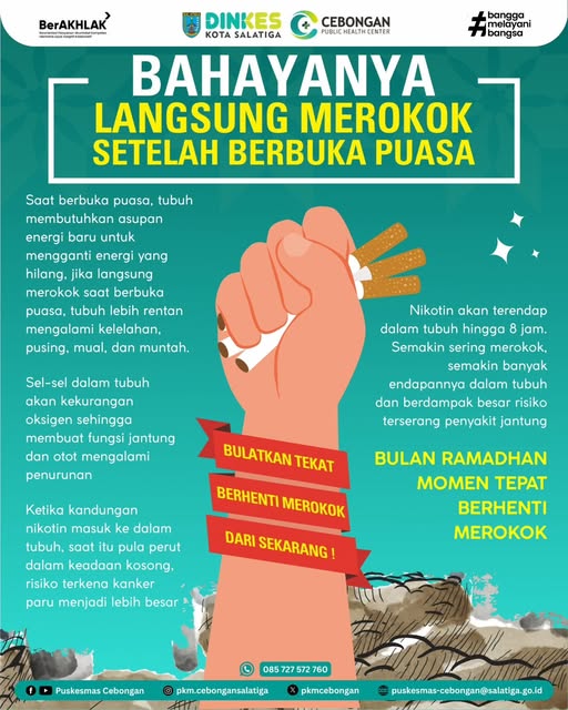 Saat berbuka puasa, tubuh membutuhkan asupan energi baru untuk mengganti energi yang hilang, jika langsung merokok saat berbuka puasa, tubuh lebih rentan mengalami kelelahan, pusing, mual, dan muntah.