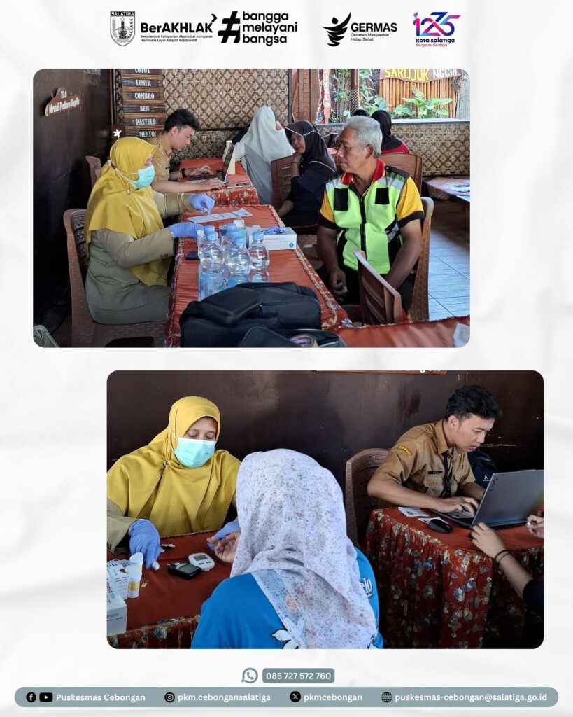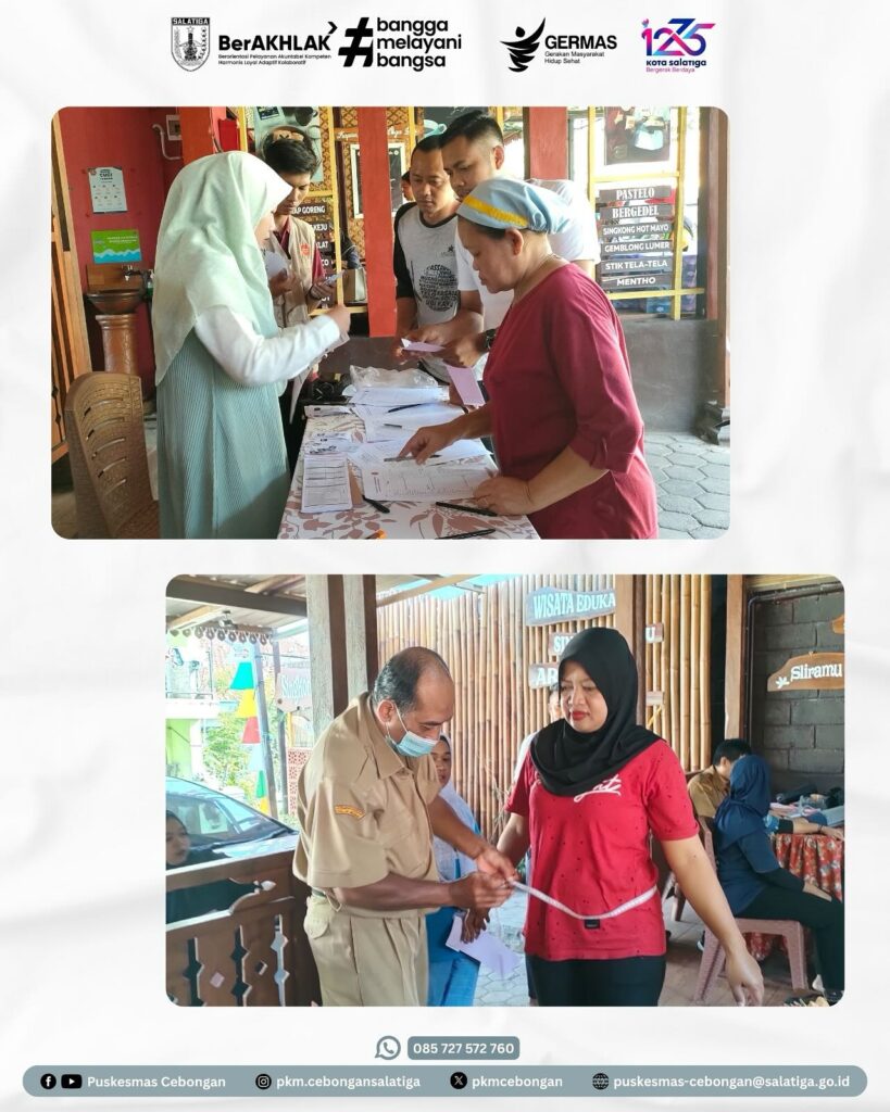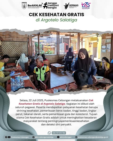 Selasa, 22 Juli 2025, Puskesmas Cebongan melaksanakan Cek Kesehatan Gratis di Argotelo Salatiga. Kegiatan ini diikuti oleh seluruh pegawai. Peserta mendapatkan pelayanan kesehatan berupa skrining kesehatan, pemeriksaan berat badan, tinggi badan, lingkar perut, tekanan darah, serta pemeriksaan gula dan kolesterol. Tujuan utama Cek Kesehatan Gratis adalah untuk meningkatkan kesadaran masyarakat tentang pentingnya pemeriksaan kesehatan dan deteksi dini penyakit.