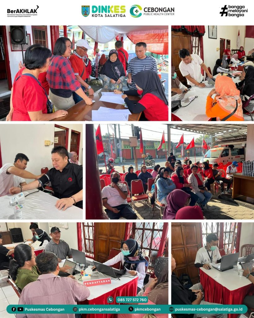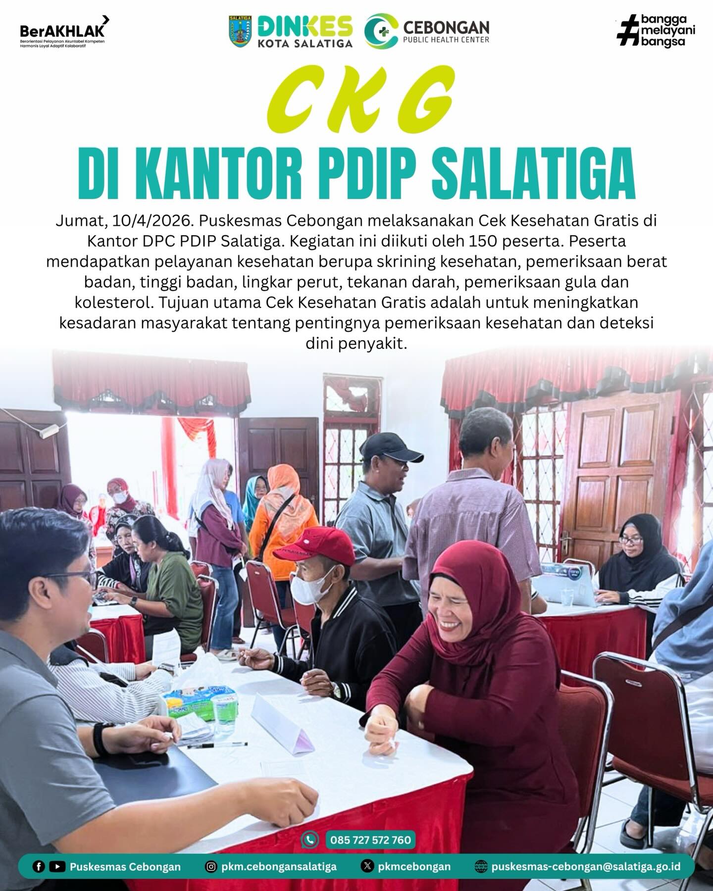 Jumat, 10 April 2026, Puskesmas Cebongan melaksanakan Cek Kesehatan Gratis di Kantor DPC PDI Salatiga. Kegiatan ini diikuti oleh 150 peserta. Peserta mendapatkan pelayanan kesehatan berupa skrining kesehatan, pemeriksaan berat badan, tinggi badan, lingkar perut, tekanan darah, pemeriksaan gula, dan kolesterol. Tujuan utama Cek Kesehatan Gratis adalah untuk meningkatkan kesadaran masyarakat tentang pentingnya pemeriksaan kesehatan dan deteksi dini penyakit.
