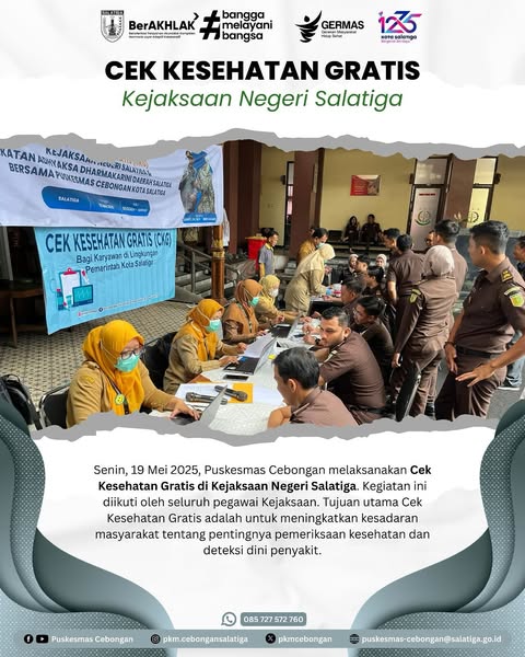 Senin, 19 Mei 2025, Puskesmas Cebongan melaksanakan Cek Kesehatan Gratis di Kejaksaan Negeri Salatiga. Kegiatan ini diikuti oleh seluruh pegawai Kejaksaan. Peserta mendapatkan pelayanan kesehatan berupa skrining kesehatan, pemeriksaan berat badan, tinggi badan, lingkar perut, tekanan darah, pemeriksaan gigi, serta pemeriksaan darah lengkap. Tujuan utama Cek Kesehatan Gratis adalah untuk meningkatkan kesadaran masyarakat tentang pentingnya pemeriksaan kesehatan dan deteksi dini penyakit.