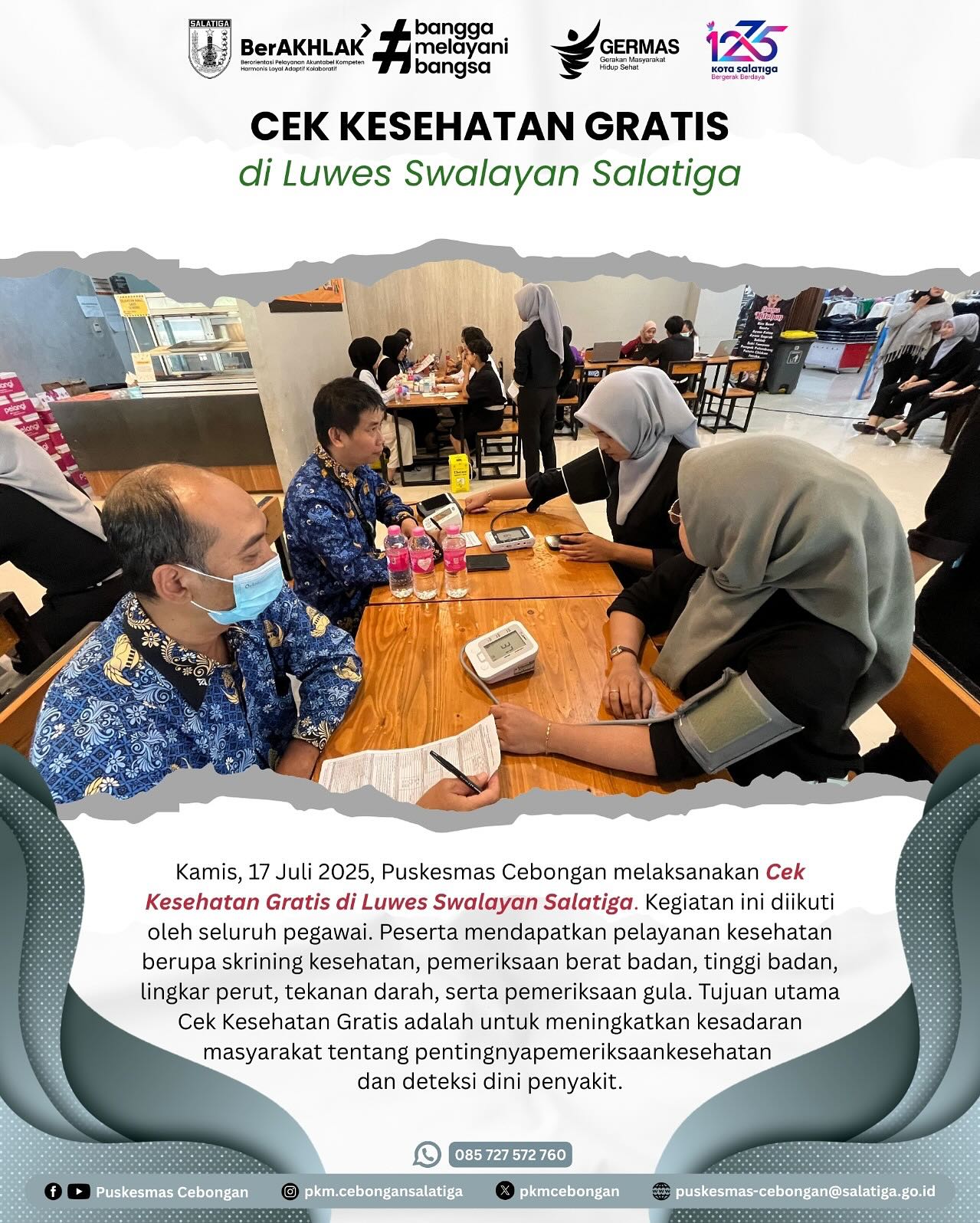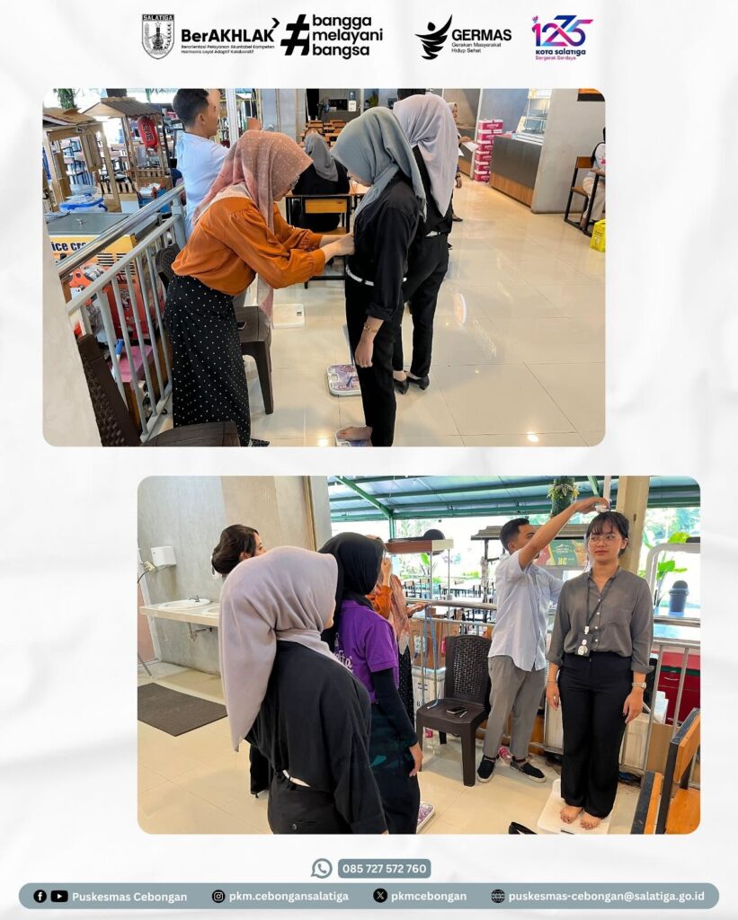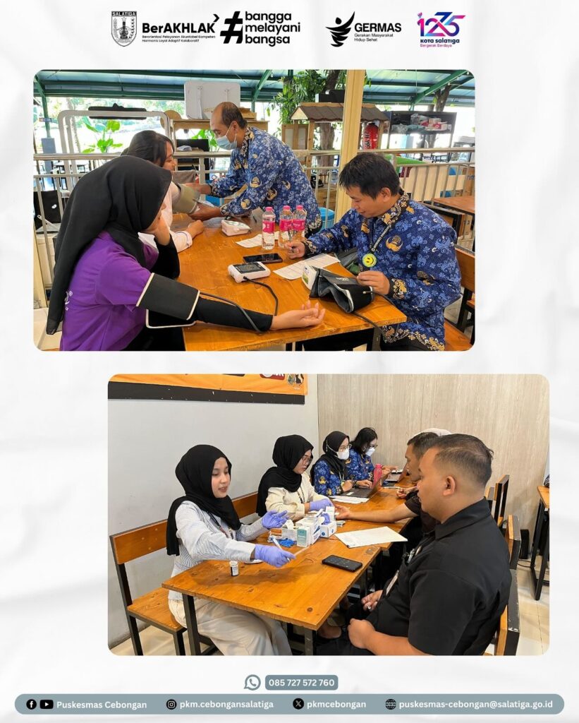 Kamis, 17 Juli 2025, Puskesmas Cebongan melaksanakan Cek Kesehatan Gratis di Luwes Swalayan Salatiga. Kegiatan ini diikuti oleh seluruh pegawai. Peserta mendapatkan pelayanan kesehatan berupa skrining kesehatan, pemeriksaan berat badan, tinggi badan, lingkar perut, tekanan darah, serta pemeriksaan gula. Tujuan utama Cek Kesehatan Gratis adalah untuk meningkatkan kesadaran masyarakat tentang pentingnya pemeriksaankesehatan dan deteksi dini penyakit.