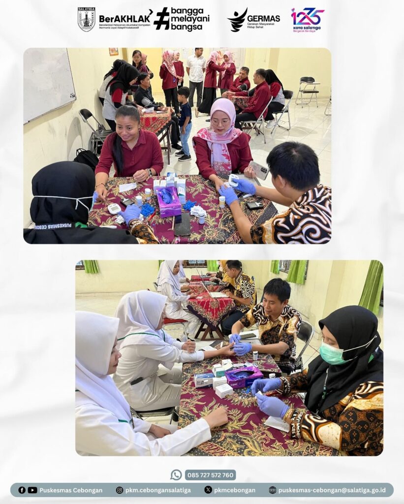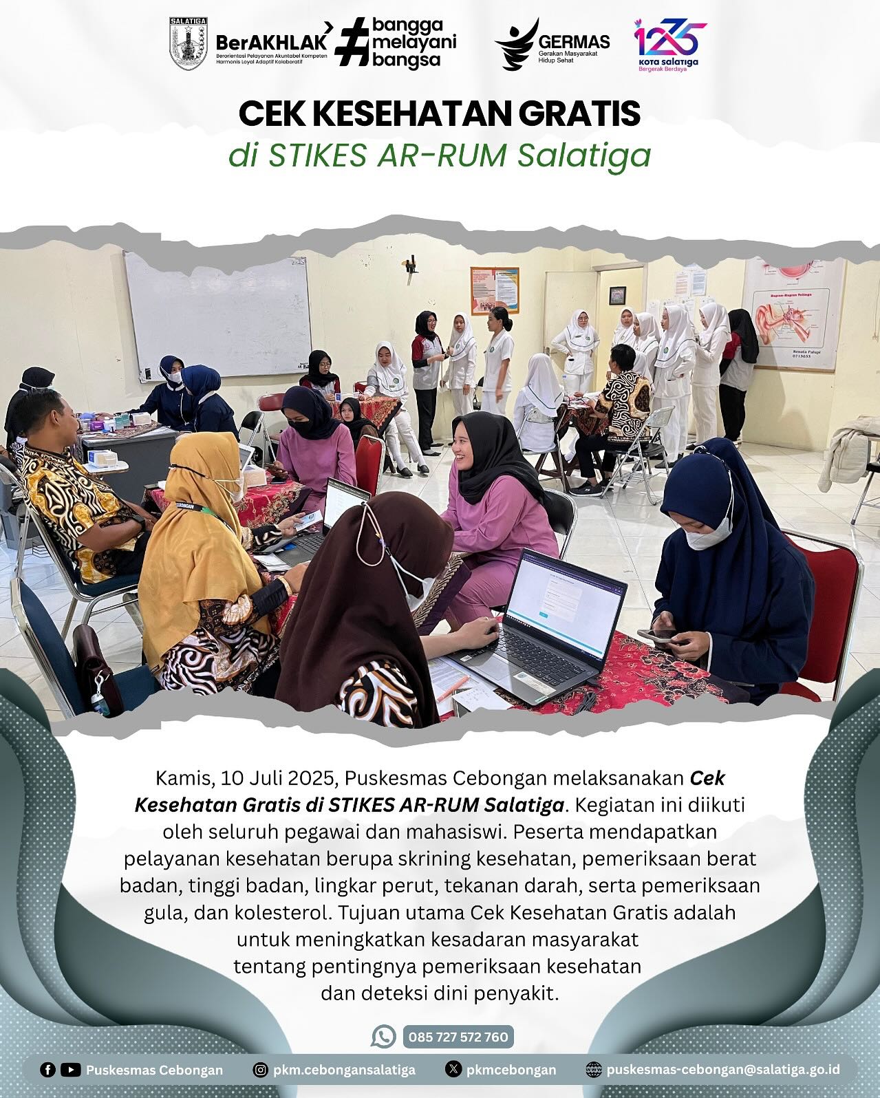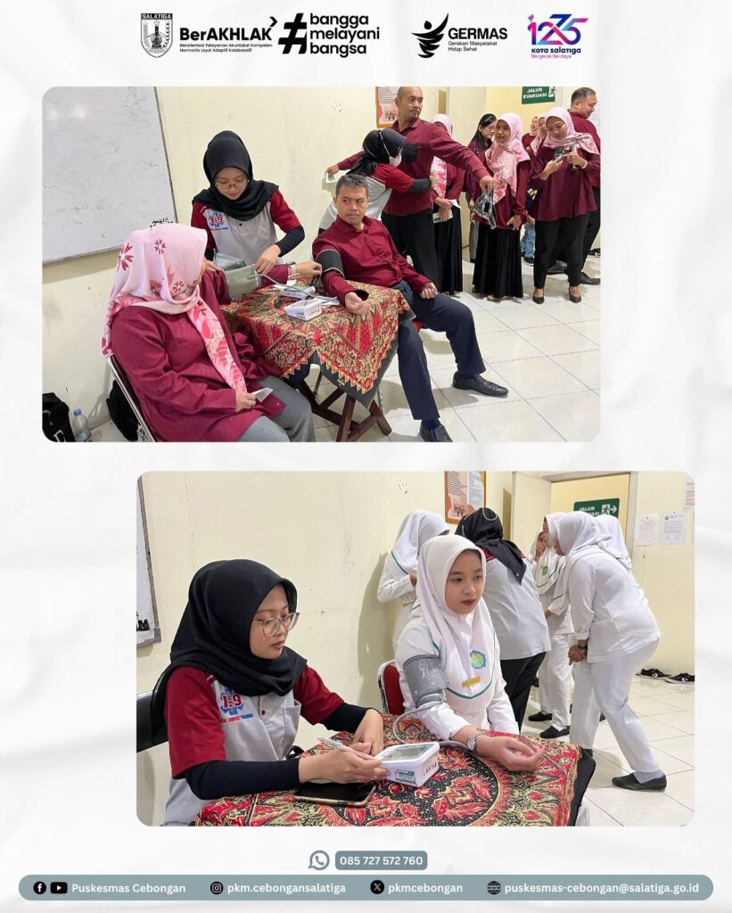 Kamis, 10 Juli 2025, Puskesmas Cebongan melaksanakan Cek Kesehatan Gratis di STIKES AR-RUM Salatiga. Kegiatan ini diikuti oleh seluruh pegawai dan mahasiswi. Peserta mendapatkan pelayanan kesehatan berupa skrining kesehatan, pemeriksaan berat badan, tinggi badan, lingkar perut, tekanan darah, serta pemeriksaan gula, dan kolesterol.