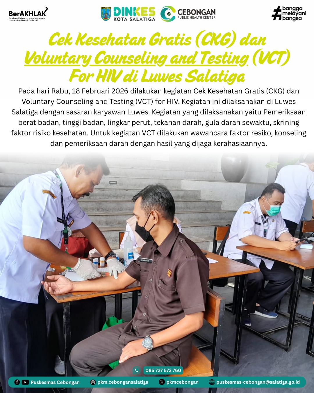 Pada hari Rabu, 18 Februari 2026 dilakukan kegiatan Cek Kesehatan Gratis (CKG) dan Voluntary Counseling and Testing (VCT) for HIV. Kegiatan ini dilaksanakan di Luwes Salatiga dengan sasaran karyawan Luwes. Kegiatan yang dilaksanakan yaitu Pemeriksaan berat badan, tinggi badan, lingkar perut, tekanan darah, gula darah sewaktu, skrining faktor risiko kesehatan. Untuk kegiatan VCT dilakukan wawancara faktor resiko, konseling dan pemeriksaan darah dengan hasil yang dijaga kerahasiaannya.