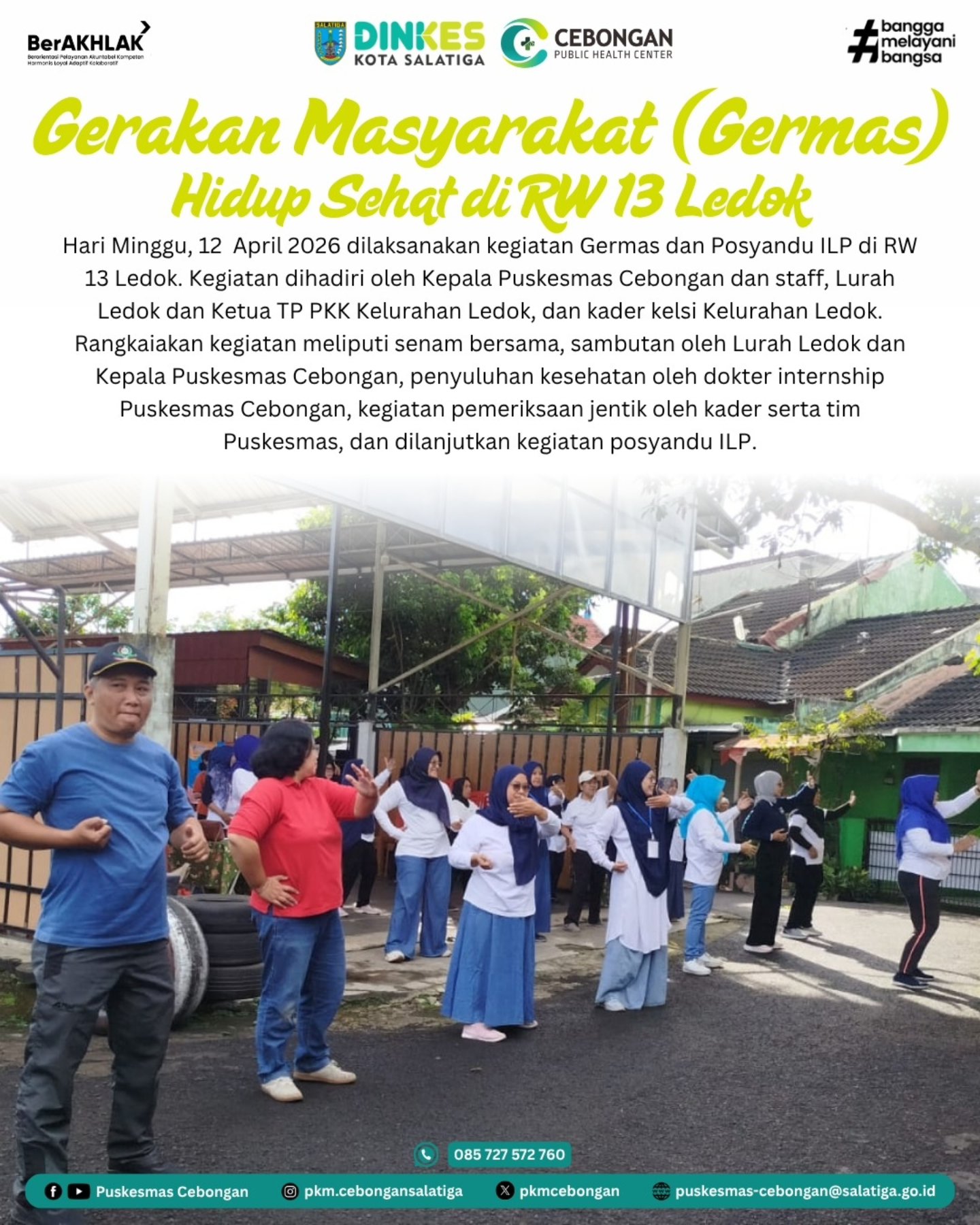 Hari Minggu, 12 April 2026 dilaksanakan kegiatan Germas dan Posyandu ILP di RW 13 Ledok. Kegiatan dihadiri oleh Kepala Puskesmas Cebongan dan staff, Lurah Ledok dan Ketua TP PKK Kelurahan Ledok, dan kader kelsi Kelurahan Ledok. Rangkaiakan kegiatan meliputi senam bersama, sambutan oleh Lurah Ledok dan Kepala Puskesmas Cebongan, penyuluhan kesehatan oleh dokter internship Puskesmas Cebongan, kegiatan pemeriksaan jentik oleh kader serta tim Puskesmas, dan dilanjutkan kegiatan posyandu ILP.