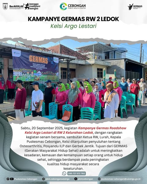 Sabtu, 20 September 2025, kegiatan Kampanye Germas Roadshow Kelsi Argo Lestari di RW 2 Kelurahan Ledok, dengan rangkaian kegiatan senam bersama, sambutan Ketua RW, Lurah, Kepala Puskesmas Cebongan, Kelsi dilanjutkan penyuluhan tentang Osteoarthritis, Posyandu ILP dan Gerbek Jentik. Tujuan dari GERMAS (Gerakan Masyarakat Hidup Sehat) adalah untuk meningkatkan kesadaran, kemauan dan kemampuan setiap orang untuk hidup sehat, sehingga berdampak pada peningkatan