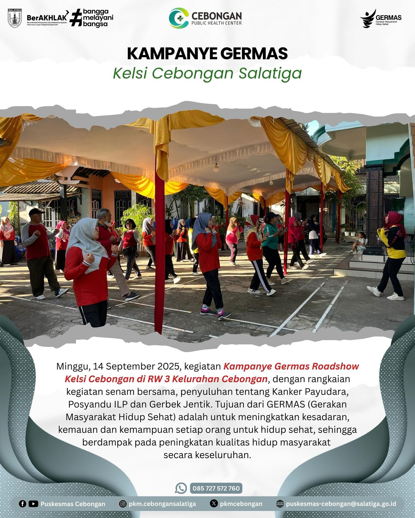 Minggu, 14 September 2025, kegiatan Kampanye Germas Roadshow Kelsi Cebongan di RW 3 Kelurahan Cebongan, dengan rangkaian kegiatan senam bersama, penyuluhan tentang Kanker Payudara, Posyandu ILP dan Gerbek Jentik. Tujuan dari GERMAS (Gerakan Masyarakat Hidup Sehat) adalah untuk meningkatkan kesadaran, kemauan dan kemampuan setiap orang untuk hidup sehat, sehingga berdampak pada peningkatan kualitas hidup masyarakat secara keseluruhan.