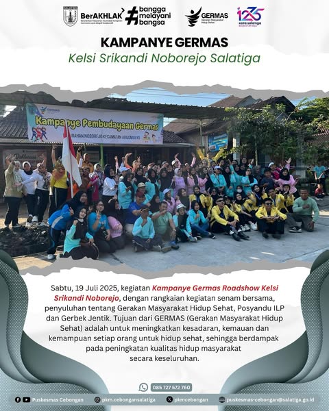 Sabtu, 19 Juli 2025, kegiatan Kampanye Germas Roadshow Kelsi Srikandi Noborejo, dengan rangkaian kegiatan senam bersama, penyuluhan tentang Gerakan Masyarakat Hidup Sehat dan kewaspadaan dini terhadap bencana / kebakaran, Posyandu ILP dan Gerbek Jentik. Tujuan dari GERMAS (Gerakan Masyarakat Hidup Sehat) adalah untuk meningkatkan kesadaran, kemauan dan kemampuan setiap orang untuk hidup sehat, sehingga berdampak pada peningkatan kualitas hidup masyarakat secara keseluruhan.