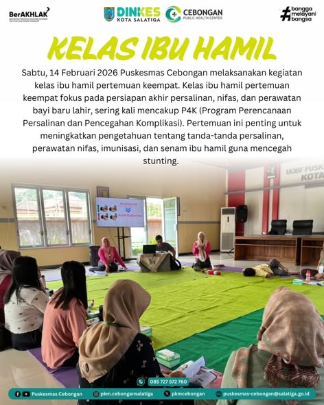 Sabtu, 14 Februari 2026 Puskesmas Cebongan melaksanakan kegiatan kelas ibu hamil pertemuan keempat. Kelas ibu hamil pertemuan keempat fokus pada persiapan akhir persalinan, nifas, dan perawatan bayi baru lahir, sering kali mencakup P4K (Program Perencanaan Persalinan dan Pencegahan Komplikasi). Pertemuan ini penting untuk meningkatkan pengetahuan tentang tanda-tanda persalinan, perawatan nifas, imunisasi, dan senam ibu hamil guna mencegah stunting.
