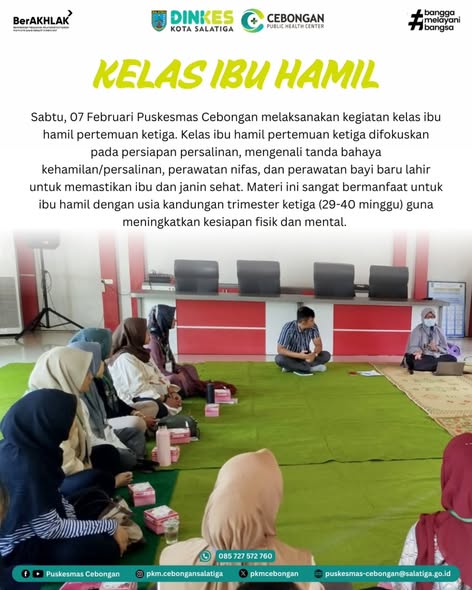 Sabtu, 07 Februari Puskesmas Cebongan melaksanakan kegiatan kelas ibu hamil pertemuan ketiga. Kelas ibu hamil pertemuan ketiga difokuskan pada persiapan persalinan, mengenali tanda bahaya kehamilan/persalinan, perawatan nifas, dan perawatan bayi baru lahir untuk memastikan ibu dan janin sehat. Materi ini sangat bermanfaat untuk ibu hamil dengan usia kandungan trimester ketiga (29-40 minggu) guna meningkatkan kesiapan fisik dan mental.