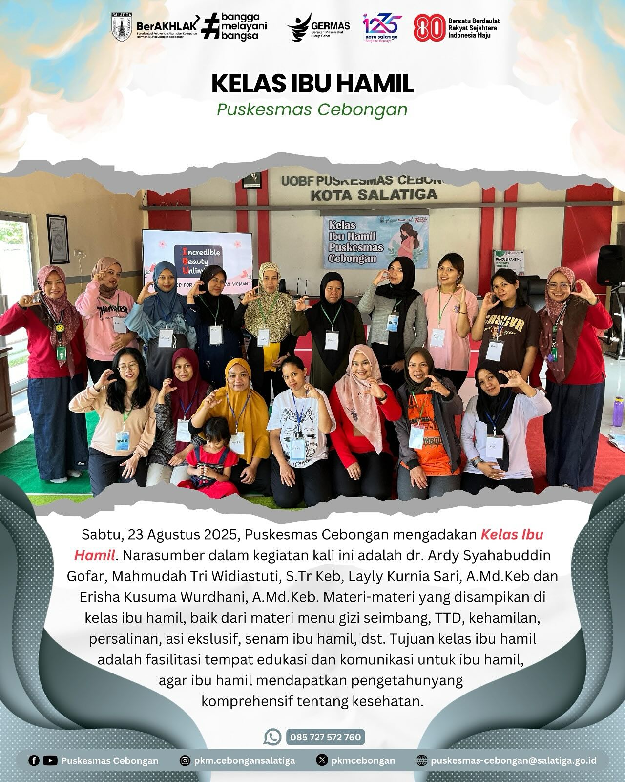 Sabtu, 23 Agustus 2025, Puskesmas Cebongan mengadakan Kelas Ibu Hamil. Narasumber dalam kegiatan kali ini adalah dr. Ardy Syahabuddin Gofar, Mahmudah Tri Widiastuti, S.Tr Keb, Layly Kurnia Sari, A.Md.Keb dan Erisha Kusuma Wurdhani, A.Md.Keb. Materi-materi yang disampikan di kelas ibu hamil, baik dari materi menu gizi seimbang, TTD, kehamilan, persalinan, asi ekslusif, senam ibu hamil, dst. Tujuan kelas ibu hamil adalah fasilitasi tempat edukasi dan komunikasi untuk ibu hamil, agar ibu hamil mendapatkan pengetahuan yang komprehensif tentang kesehatan.