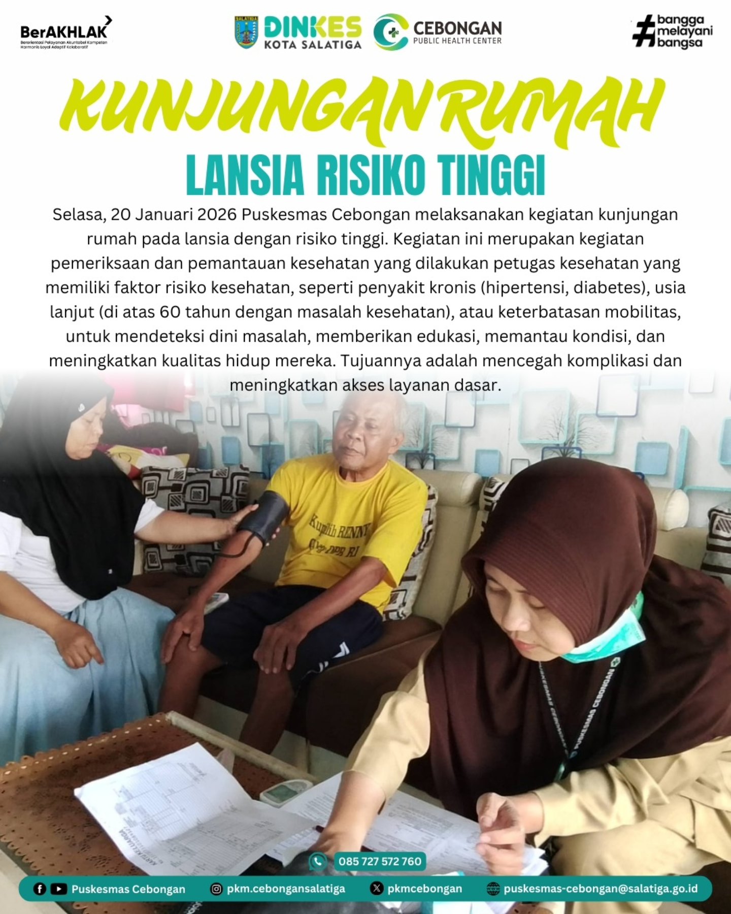 Selasa, 20 Januari 2026 Puskesmas Cebongan melaksanakan kegiatan kunjungan rumah pada lansia dengan risiko tinggi. Kegiatan ini merupakan kegiatan pemeriksaan dan pemantauan kesehatan yang dilakukan petugas kesehatan yang memiliki faktor risiko kesehatan, seperti penyakit kronis (hipertensi, diabetes), usia lanjut (di atas 60 tahun dengan masalah kesehatan), atau keterbatasan mobilitas, untuk mendeteksi dini masalah, memberikan edukasi, memantau kondisi, dan meningkatkan kualitas hidup mereka. Tujuannya adalah mencegah komplikasi dan meningkatkan akses layanan dasar.