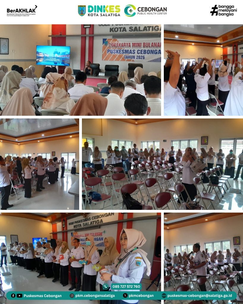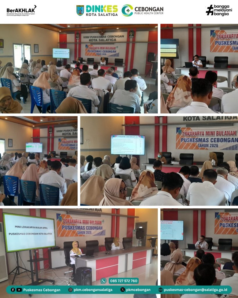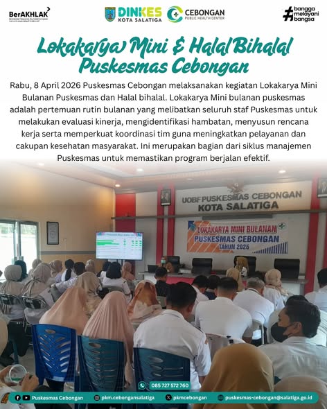 Rabu, 8 April 2026 Puskesmas Cebongan melaksanakan kegiatan Lokakarya Mini Bulanan Puskesmas dan Halal bihalal. Lokakarya Mini bulanan puskesmas adalah pertemuan rutin bulanan yang melibatkan seluruh staf Puskesmas untuk melakukan evaluasi kinerja, mengidentifikasi hambatan, menyusun rencana kerja serta memperkuat koordinasi tim guna meningkatkan pelayanan dan cakupan kesehatan masyarakat. Ini merupakan bagian dari siklus manajemen Puskesmas untuk memastikan program berjalan efektif.