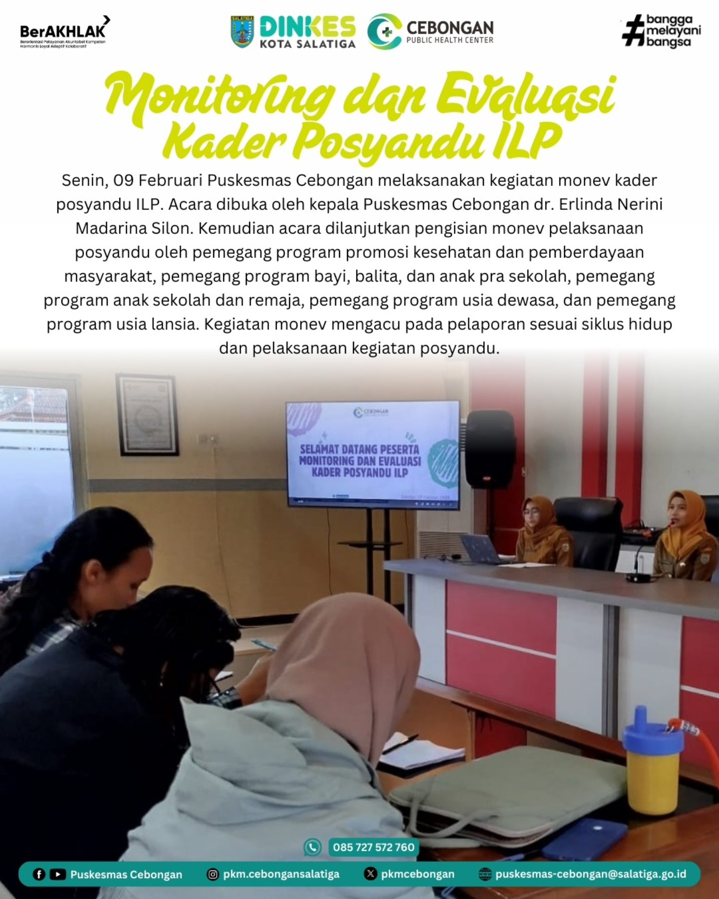 Senin, 09 Februari Puskesmas Cebongan melaksanakan kegiatan monev kader posyandu ILP. Acara dibuka oleh kepala Puskesmas Cebongan dr. Erlinda Nerini Madarina Silon. Kemudian acara dilanjutkan pengisian monev pelaksanaan posyandu oleh pemegang program promosi kesehatan dan pemberdayaan masyarakat, pemegang program bayi, balita, dan anak pra sekolah, pemegang program anak sekolah dan remaja, pemegang program usia dewasa, dan pemegang program usia lansia. Kegiatan monev mengacu pada pelaporan sesuai siklus hidup dan pelaksanaan kegiatan posyandu.