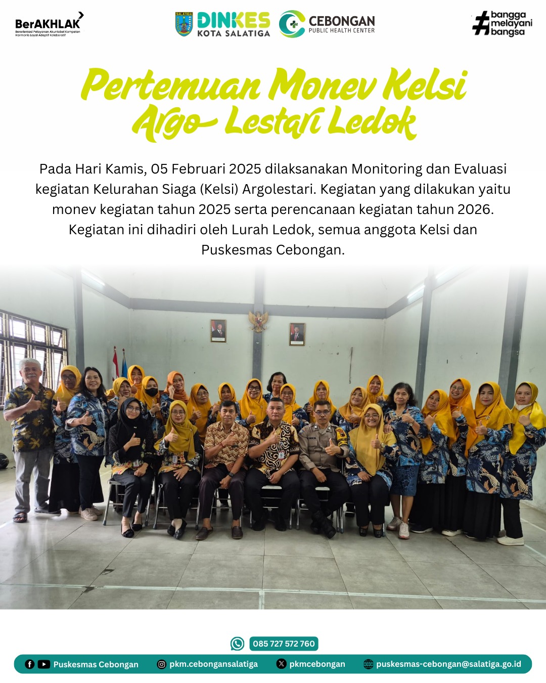 Pada Hari Kamis, 05 Februari 2025 dilaksanakan Monitoring dan Evaluasi kegiatan Kelurahan Siaga (Kelsi) Argolestari. Kegiatan yang dilakukan yaitu monev kegiatan tahun 2025 serta perencanaan kegiatan tahun 2026. Kegiatan ini dihadiri oleh Lurah Ledok, semua anggota Kelsi dan Puskesmas Cebongan.