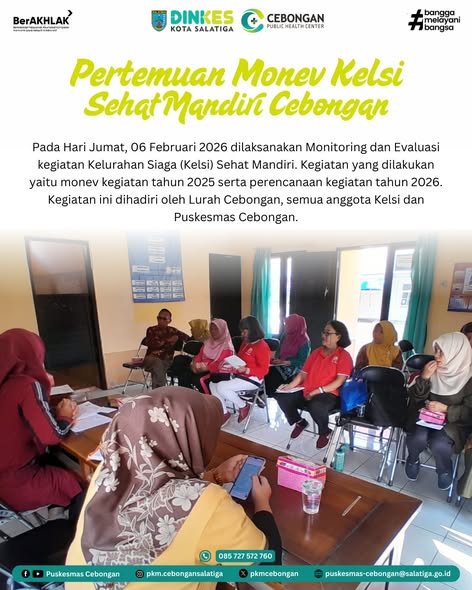 Pada Hari Jumat, 06 Februari 2026 dilaksanakan Monitoring dan Evaluasi kegiatan Kelurahan Siaga (Kelsi) Sehat Mandiri. Kegiatan yang dilakukan yaitu monev kegiatan tahun 2025 serta perencanaan kegiatan tahun 2026. Kegiatan ini dihadiri oleh Lurah Cebongan, semua anggota Kelsi dan Puskesmas Cebongan.