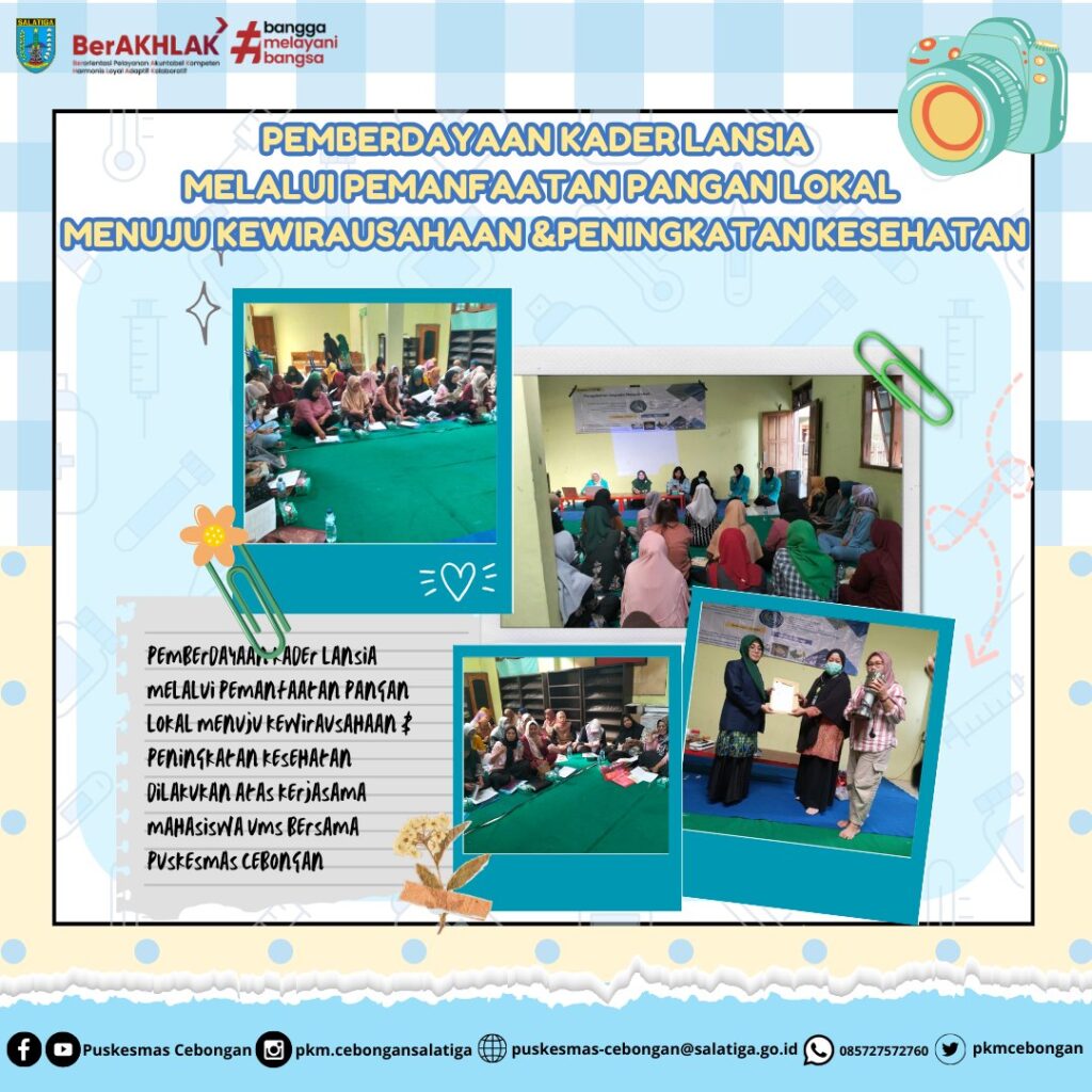 Pemberdayaan kader lansia melalui pemanfaatan pangan lokal menuju kewirausahaan & peningkatan kesehatan dilakukan atas kerjasama mahasiswa UMS dengan Puskesmas Cebongan. Kegiatan dilaksanakan di Madin Masjid Al Ghozali Noborejo.