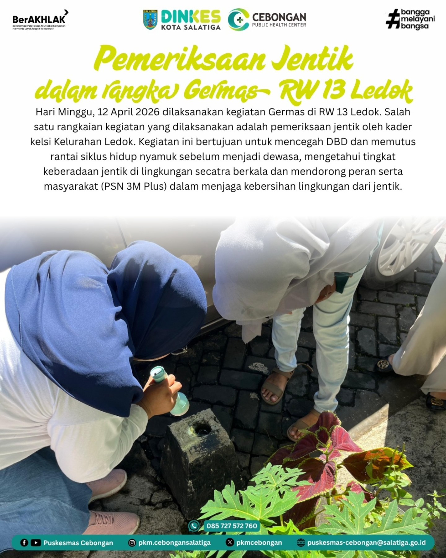 Hari Minggu, 12 April 2026 dilaksanakan kegiatan Germas di RW 13 Ledok. Salah satu rangkaian kegiatan yang dilaksanakan adalah pemeriksaan jentik oleh kader kelsi Kelurahan Ledok. Kegiatan ini bertujuan untuk mencegah DBD dan memutus rantai siklus hidup nyamuk sebelum menjadi dewasa, mengetahui tingkat keberadaan jentik di lingkungan secatra berkala dan mendorong peran serta masyarakat (PSN 3M Plus) dalam menjaga kebersihan lingkungan dari jentik.