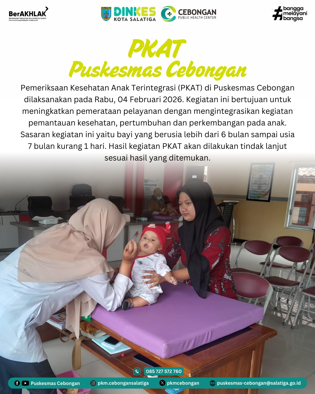 Pemeriksaan Kesehatan Anak Terintegrasi (PKAT) di Puskesmas Cebongan dilaksanakan pada Rabu, 04 Februari 2026. Kegiatan ini bertujuan untuk meningkatkan pemerataan pelayanan dengan mengintegrasikan kegiatan pemantauan kesehatan, pertumbuhan dan perkembangan pada anak. Sasaran kegiatan ini yaitu bayi yang berusia lebih dari 6 bulan sampai usia 7 bulan kurang 1 hari. Hasil kegiatan PKAT akan dilakukan tindak lanjut sesuai hasil yang ditemukan.