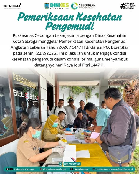 Puskesmas Cebongan bekerjasama dengan Dinas Kesehatan Kota Salatiga menggelar Pemeriksaan Kesehatan Pengemudi Angkutan Lebaran Tahun 2026 / 1447 H di Garasi PO. Blue Star pada senin, (23/2/2026). Ini dilakukan untuk menjaga kondisi kesehatan pengemudi dalam kondisi prima, guna menyambut datangnya hari Raya Idul Fitri 1447 H.