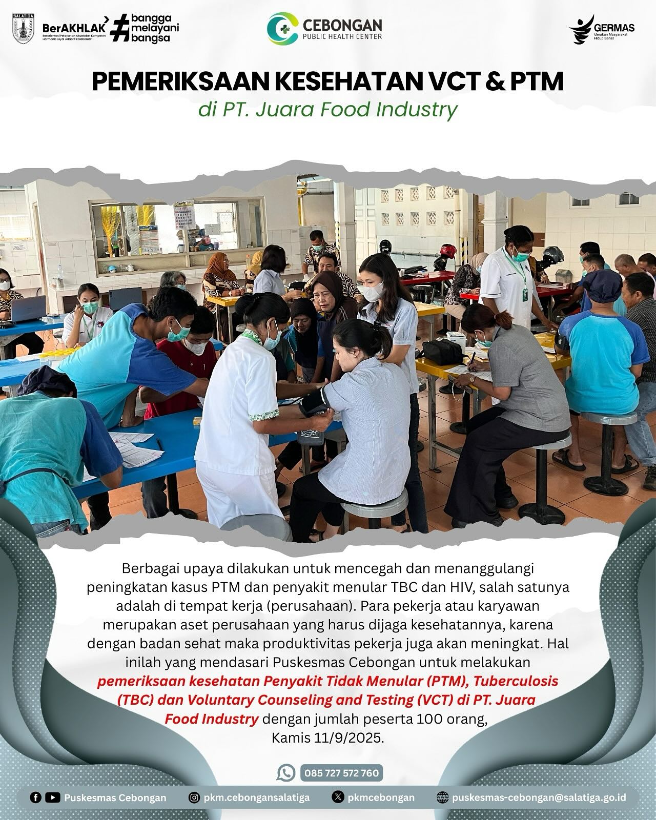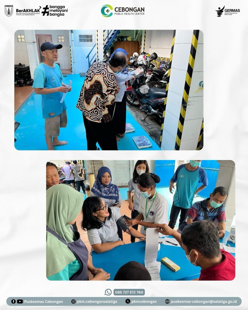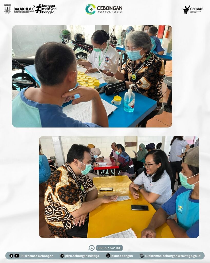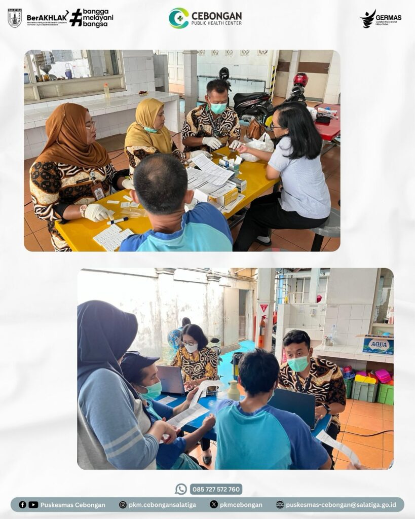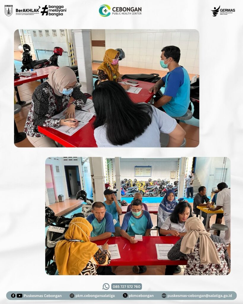 Berbagai upaya dilakukan untuk mencegah dan menanggulangi peningkatan kasus PTM dan penyakit menular TBC dan HIV, salah satunya adalah di tempat kerja (perusahaan). Para pekerja atau karyawan merupakan aset perusahaan yang harus dijaga kesehatannya, karena dengan badan sehat maka produktivitas pekerja juga akan meningkat. Hal inilah yang mendasari Puskesmas Cebongan untuk melakukan pemeriksaan kesehatan Penyakit Tidak Menular (PTM), Tuberculosis (TBC) dan Voluntary Counseling and Testing (VCT) di PT. Juara Food Industry dengan jumlah peserta 100 orang, Kamis 11/9/2025.