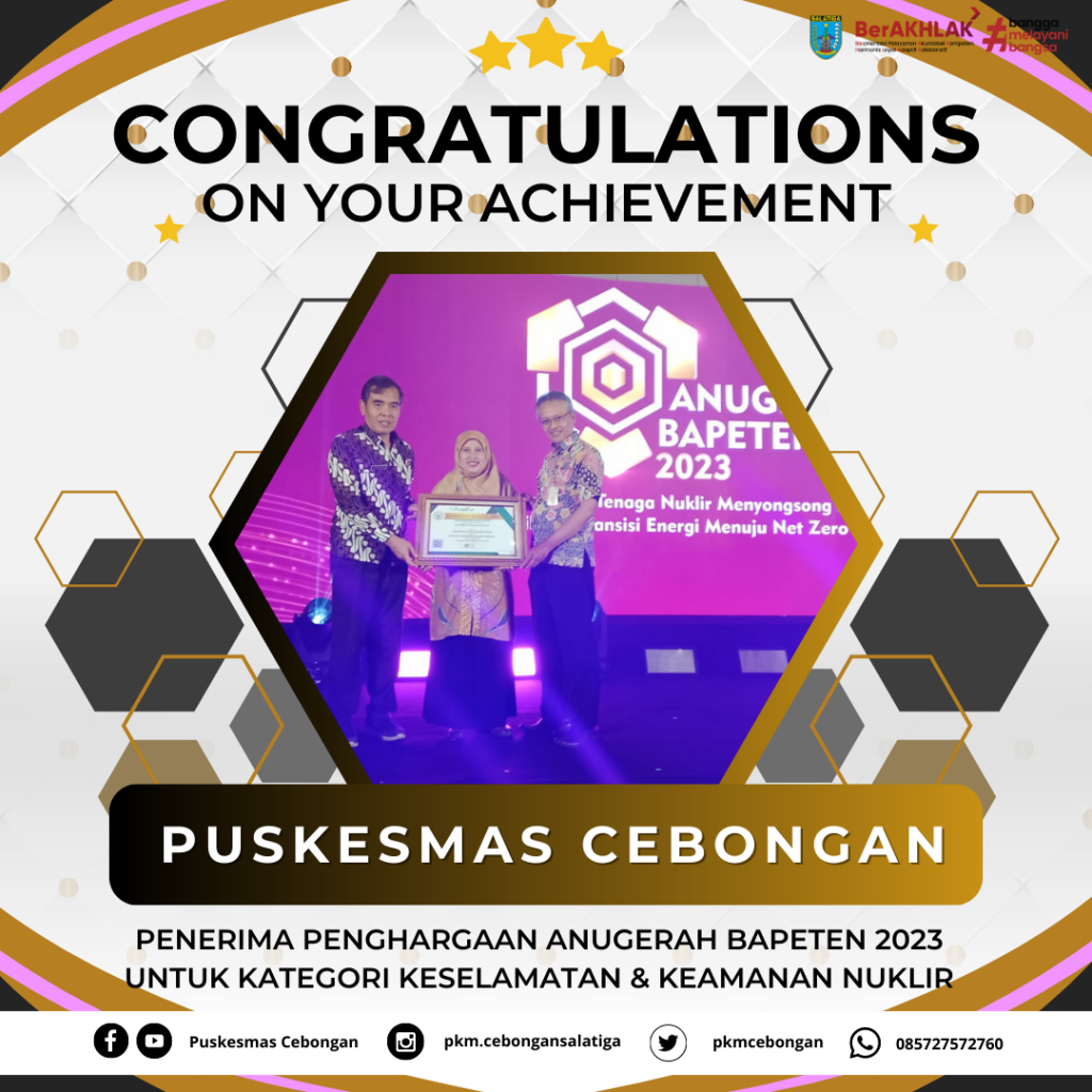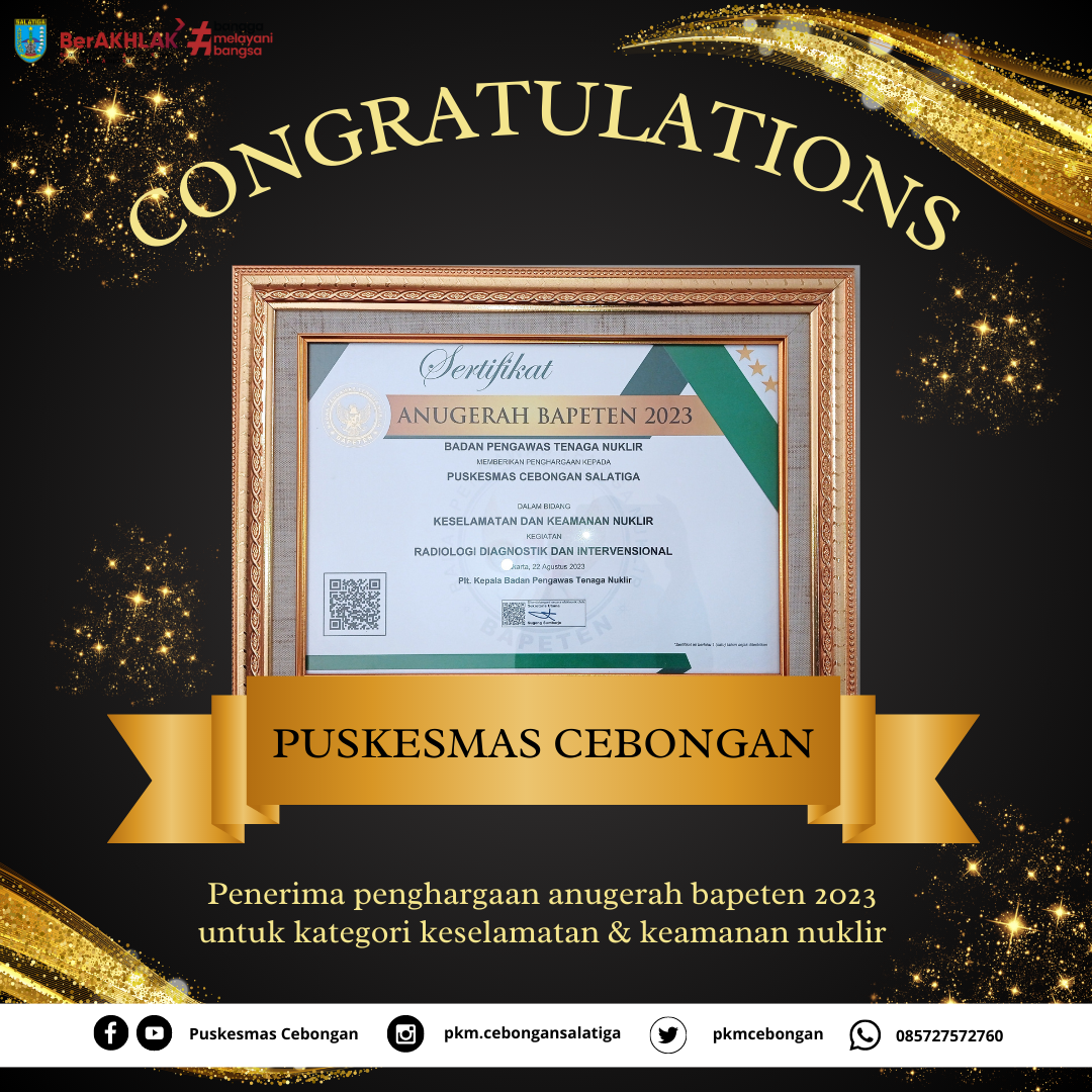 Selamat pagi Sobat Sehat, Alhamdulillah Puji syukur kami panjatkan kepada Allah SWT, Puskesmas Cebongan kembali mendapatkan Penghargaan Anugerah BAPETEN 2023 untuk kategori Keselamatan dan Keamanan Nuklir. Penghargaan ini diberikan oleh Badan Pengawas Tenaga Nuklir (BAPETEN) kepada Pemegang Izin/Fasilitas/Personil yang memiliki komitmen dan performa sangat baik dalam Keselamatan Radiasi dan/atau Keamanan Sumber Radioaktif.