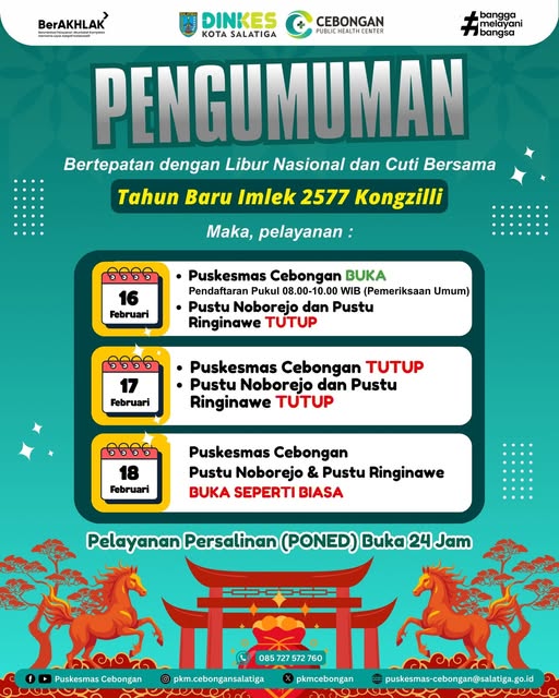 Halo sobat sehat.. Bertepatan dengan Libur Nasional dan Cuti Bersama Tahun Baru Imlek 2577 Kongzilli, Berikut kami sampaikan jadwal pelayanan di Puskesmas Cebongan, Pustu Noborejo dan Pustu Ringinawe.. Navigasi pos Kelas ibu hamil pertemuan keempatPertemuan Jejaring di wilayah kerja Puskesmas Cebongan