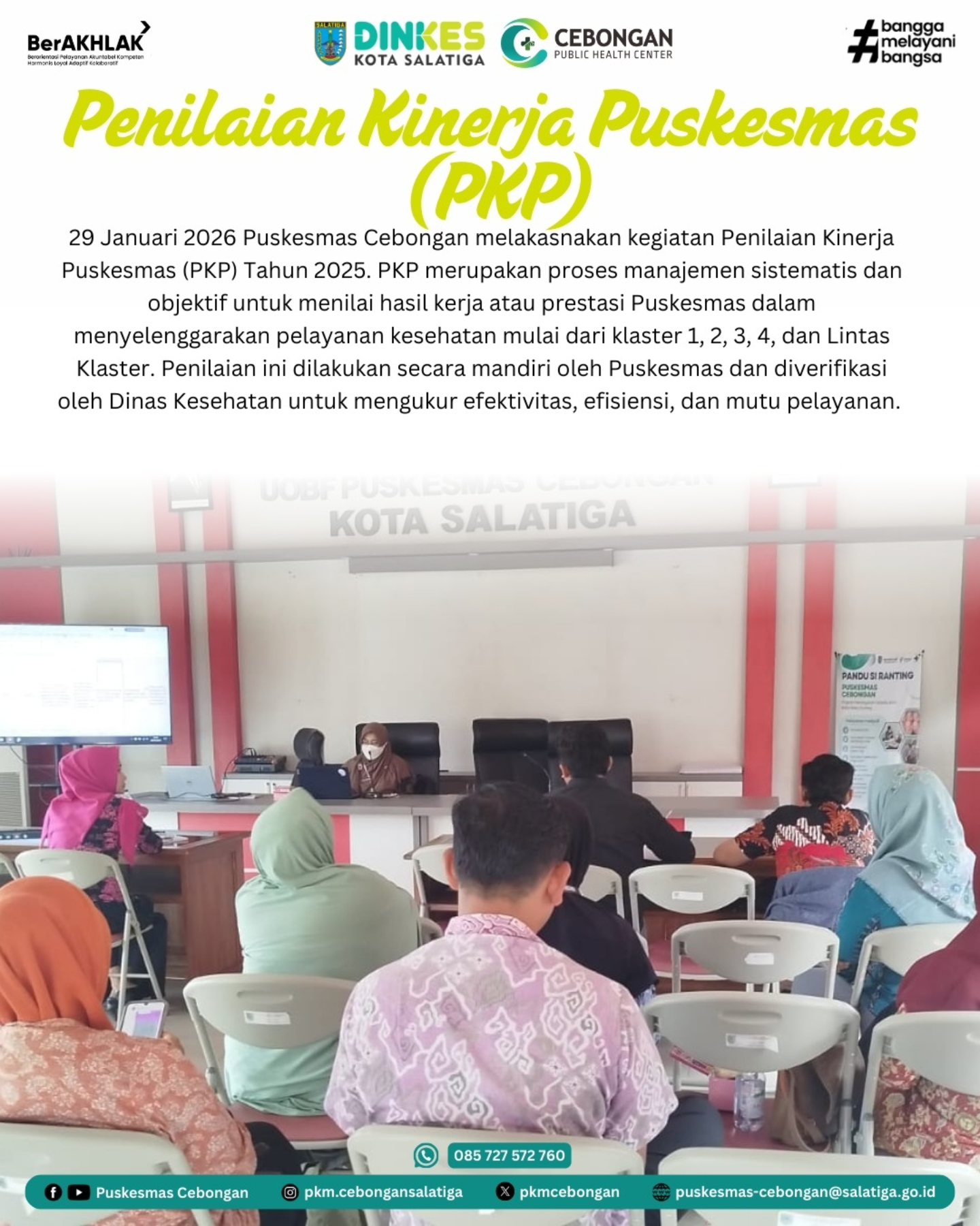 29 Januari 2026 Puskesmas Cebongan melakasnakan kegiatan Penilaian Kinerja Puskesmas (PKP) Tahun 2025. PKP merupakan proses manajemen sistematis dan objektif untuk menilai hasil kerja atau prestasi Puskesmas dalam menyelenggarakan pelayanan kesehatan mulai dari klaster 1, 2, 3, 4, dan Lintas Klaster. Penilaian ini dilakukan secara mandiri oleh Puskesmas dan diverifikasi oleh Dinas Kesehatan untuk mengukur efektivitas, efisiensi, dan mutu pelayanan.