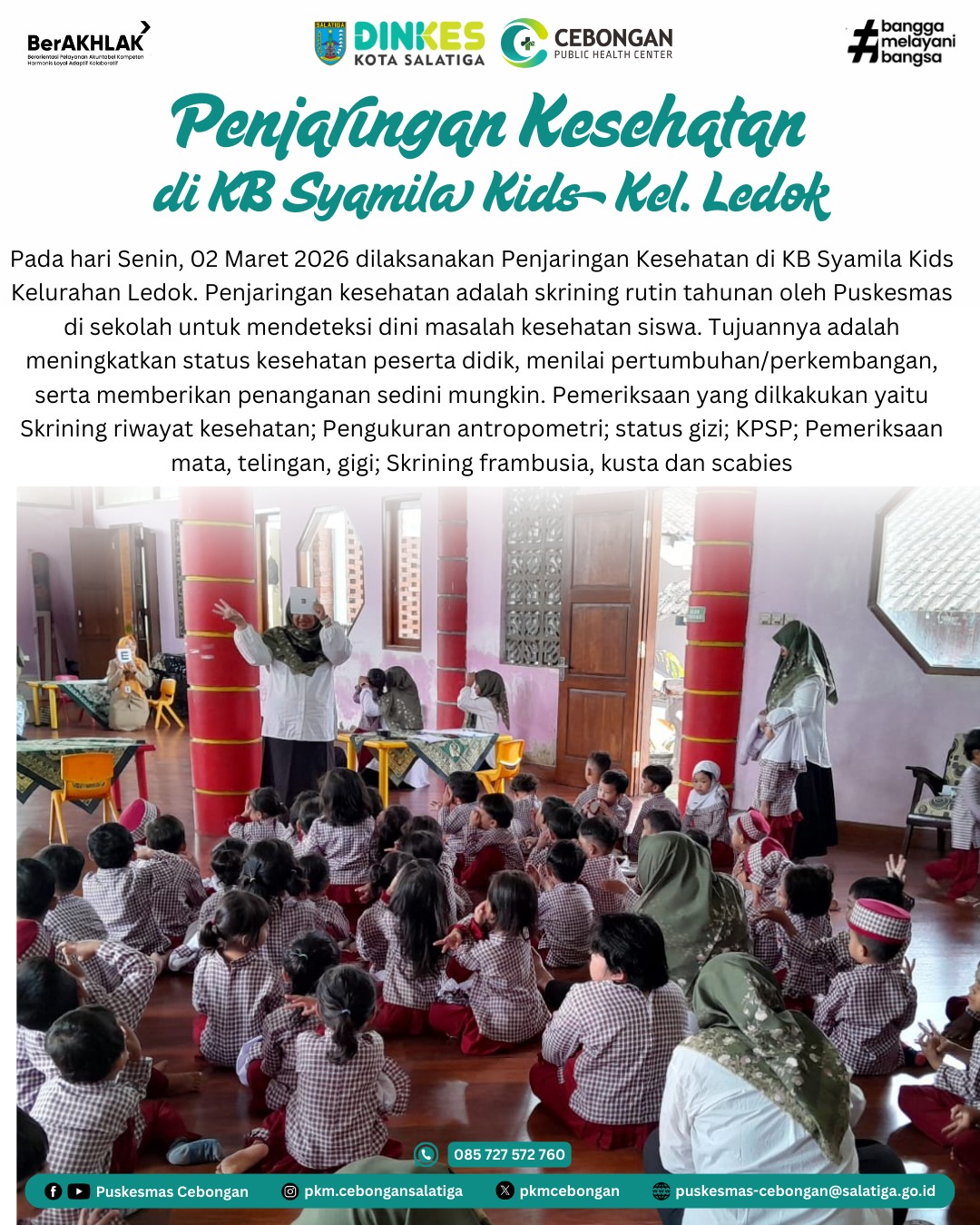 Pada hari Senin, 02 Maret 2026 dilaksanakan Penjaringan Kesehatan di KB Syamila Kids Kelurahan Ledok. Penjaringan kesehatan adalah skrining rutin tahunan oleh Puskesmas di sekolah untuk mendeteksi dini masalah kesehatan siswa. Tujuannya adalah meningkatkan status kesehatan peserta didik, menilai pertumbuhan/perkembangan, serta memberikan penanganan sedini mungkin. Pemeriksaan yang dilkakukan yaitu Skrining riwayat kesehatan; Pengukuran antropometri; status gizi; KPSP; Pemeriksaan mata, telingan, gigi; Skrining frambusia, kusta dan scabies