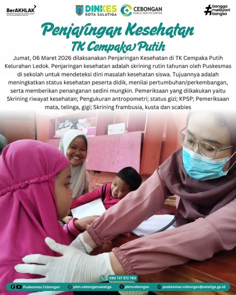 Jumat, 06 Maret 2026 dilaksanakan Penjaringan Kesehatan di TK Cempaka Putih Kelurahan Ledok. Penjaringan kesehatan adalah skrining rutin tahunan oleh Puskesmas di sekolah untuk mendeteksi dini masalah kesehatan siswa. Tujuannya adalah meningkatkan status kesehatan peserta didik, menilai pertumbuhan/perkembangan, serta memberikan penanganan sedini mungkin. Pemeriksaan yang dilkakukan yaitu Skrining riwayat kesehatan; Pengukuran antropometri; status gizi; KPSP; Pemeriksaan mata, telinga, gigi; Skrining frambusia, kusta dan scabies