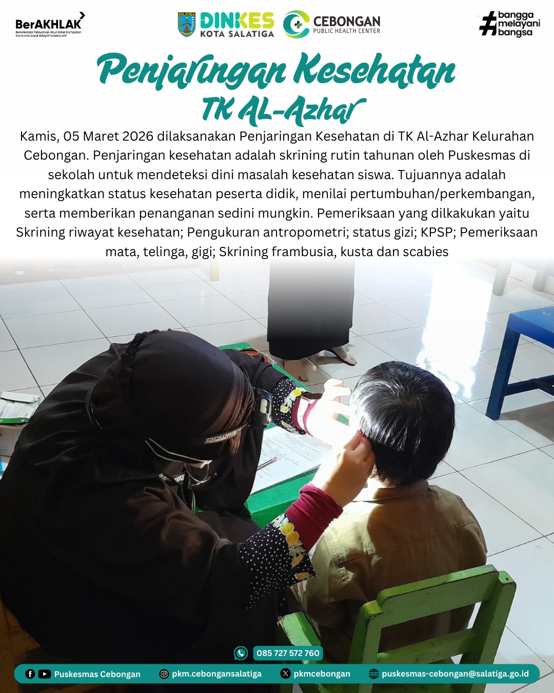Kamis, 5 Maret 2026 dilaksanakan Penjaringan Kesehatan di TK UPTD SPNF SKB Kelurahan Cebongan. Penjaringan kesehatan adalah skrining rutin tahunan oleh Puskesmas di sekolah untuk mendeteksi dini masalah kesehatan siswa. Tujuannya adalah meningkatkan status kesehatan peserta didik, menilai pertumbuhan/perkembangan, serta memberikan penanganan sedini mungkin. Pemeriksaan yang dilkakukan yaitu Skrining riwayat kesehatan; Pengukuran antropometri; status gizi; KPSP; Pemeriksaan mata, telinga, gigi; Skrining frambusia, kusta dan scabies