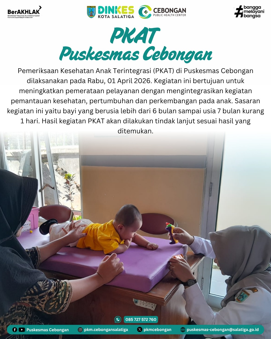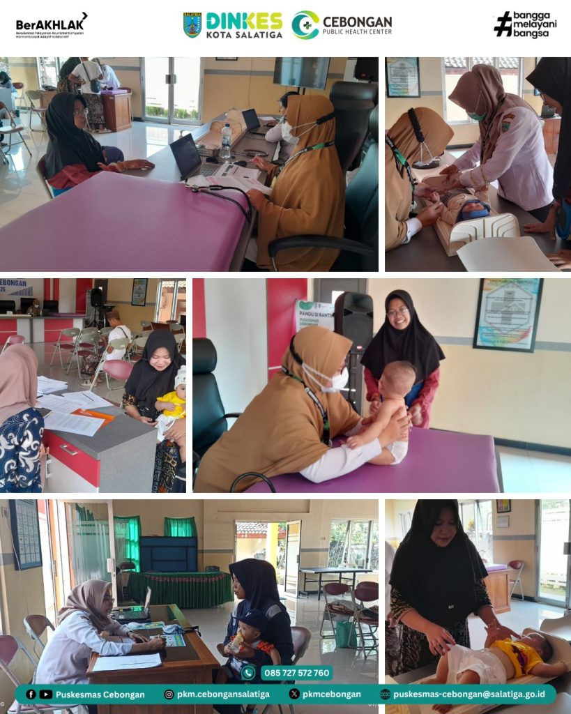 Pemeriksaan Kesehatan Anak Terintegrasi (PKAT) di Puskesmas Cebongan dilaksanakan pada Rabu, 01 April 2026. Kegiatan ini bertujuan untuk meningkatkan pemerataan pelayanan dengan mengintegrasikan kegiatan pemantauan kesehatan, pertumbuhan dan perkembangan pada anak. Sasaran kegiatan ini yaitu bayi yang berusia lebih dari 6 bulan sampai usia 7 bulan kurang 1 hari. Hasil kegiatan PKAT akan dilakukan tindak lanjut sesuai hasil yang ditemukan.