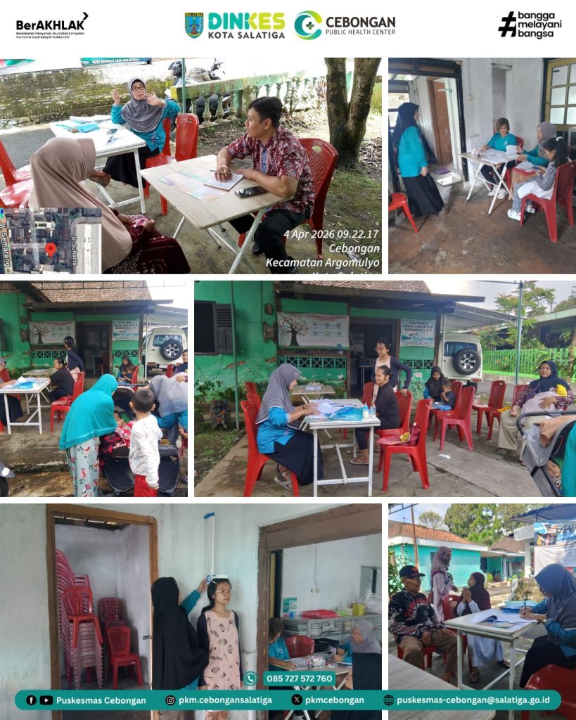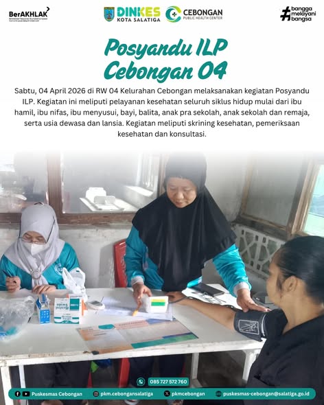 Sabtu, 04 April 2026 di RW 04 Kelurahan Cebongan melaksanakan kegiatan Posyandu ILP. Kegiatan ini meliputi pelayanan kesehatan seluruh siklus hidup mulai dari ibu hamil, ibu nifas, ibu menyusui, bayi, balita, anak pra sekolah, anak sekolah dan remaja, serta usia dewasa dan lansia. Kegiatan meliputi skrining kesehatan, pemeriksaan kesehatan dan konsultasi.