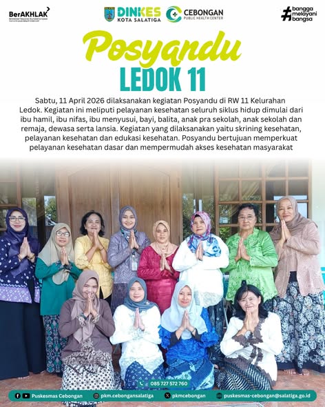 Sabtu, 11 April 2026 dilaksanakan kegiatan Posyandu di RW 11 Kelurahan Ledok. Kegiatan ini meliputi pelayanan kesehatan seluruh siklus hidup dimulai dari ibu hamil, ibu nifas, ibu menyusui, bayi, balita, anak pra sekolah, anak sekolah dan remaja, dewasa serta lansia. Kegiatan yang dilaksanakan yaitu skrining kesehatan, pelayanan kesehatan dan edukasi kesehatan. Posyandu bertujuan memperkuat pelayanan kesehatan dasar dan mempermudah akses kesehatan masyarakat.