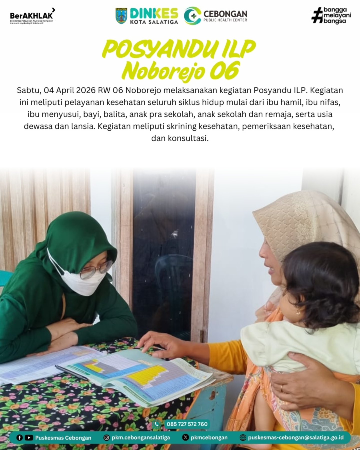 Sabtu, 04 April 2026 RW 06 Noborejo melaksanakan kegiatan Posyandu ILP. Kegiatan ini meliputi pelayanan kesehatan seluruh siklus hidup mulai dari ibu hamil, ibu nifas, ibu menyusui, bayi, balita, anak pra sekolah, anak sekolah dan remaja, serta usia dewasa dan lansia. Kegiatan meliputi skrining kesehatan, pemeriksaan kesehatan, dan konsultasi.