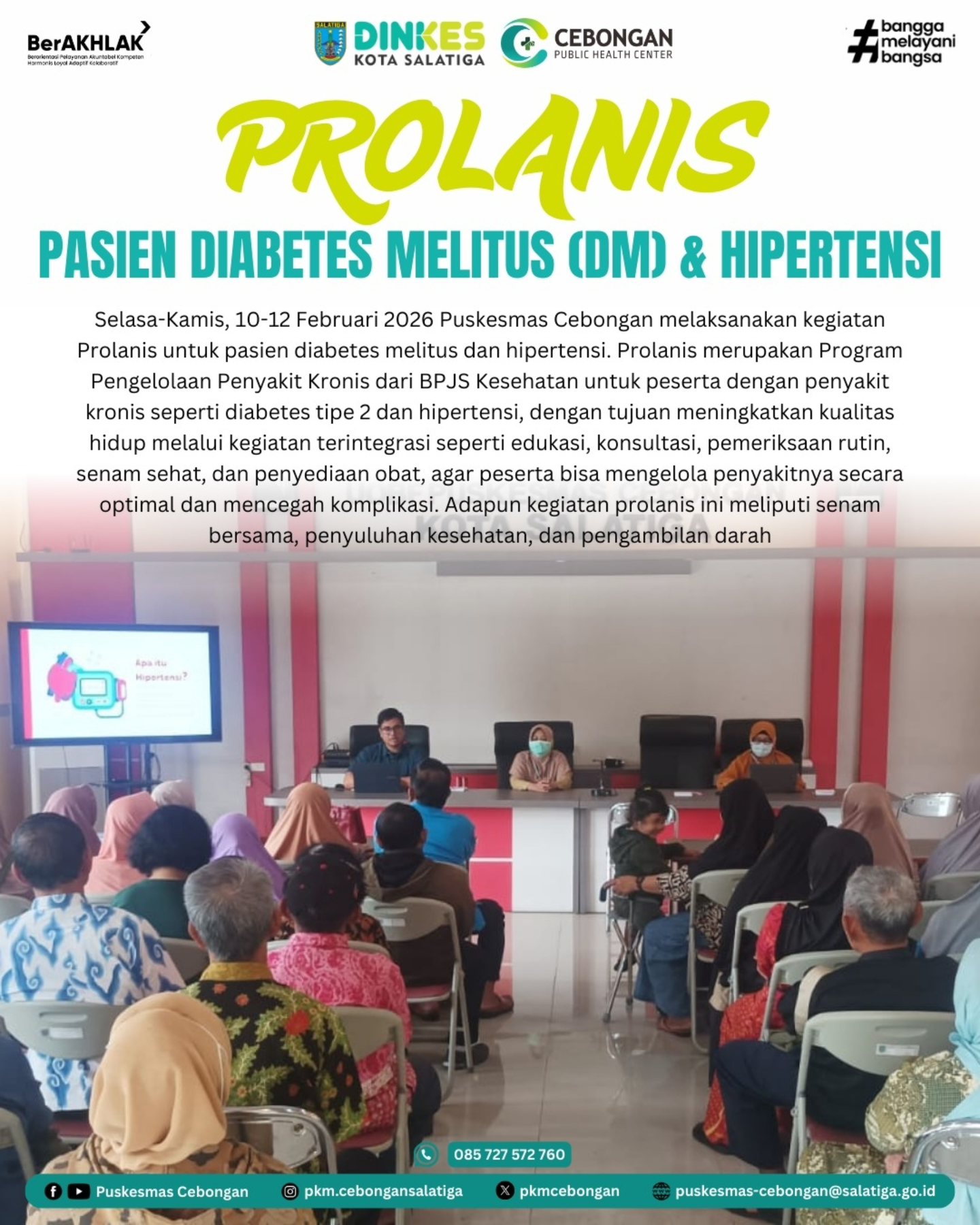 Selasa-Kamis, 10-12 Februari 2026 Puskesmas Cebongan melaksanakan kegiatan Prolanis untuk pasien diabetes melitus dan hipertensi. Prolanis merupakan Program Pengelolaan Penyakit Kronis dari BPJS Kesehatan untuk peserta dengan penyakit kronis seperti diabetes tipe 2 dan hipertensi, dengan tujuan meningkatkan kualitas hidup melalui kegiatan terintegrasi seperti edukasi, konsultasi, pemeriksaan rutin, senam sehat, dan penyediaan obat, agar peserta bisa mengelola penyakitnya secara optimal dan mencegah komplikasi. Adapun kegiatan prolanis ini meliputi senam bersama, penyuluhan kesehatan, dan pengambilan darah