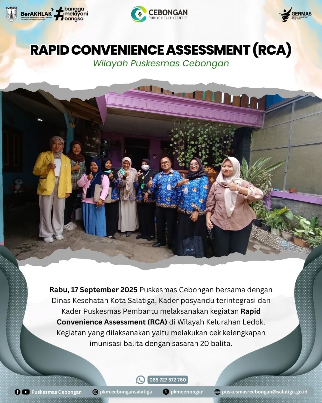 Pada hari Rabu, 17 September 2025 Puskesmas Cebongan bersama dengan Dinas Kesehatan Kota Salatiga, Kader posyandu terintegrasi dan Kader Puskesmas Pembantu melaksanakan kegiatan Rapid Convenience (RCA) di Wilayah Kelurahan Ledok. Kegiatan yang dilaksanakan yaitu melakukan cek kelengkapan imunisasi balita dengan sasaran 20 balita.