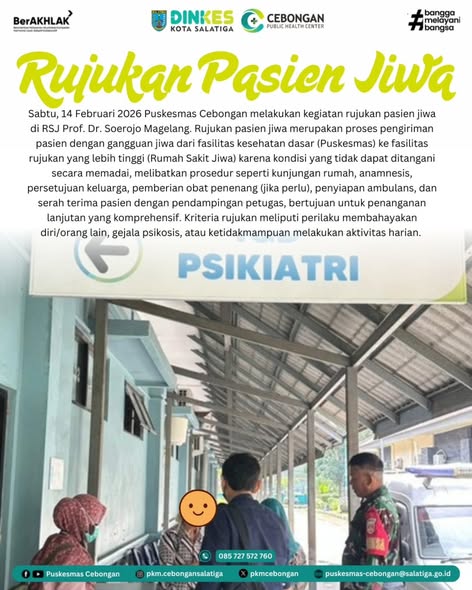 Sabtu, 14 Februari 2026 Puskesmas Cebongan melakukan kegiatan rujukan pasien jiwa di RSJ Prof. Dr. Soerojo Magelang. Rujukan pasien jiwa merupakan proses pengiriman pasien dengan gangguan jiwa dari fasilitas kesehatan dasar (Puskesmas) ke fasilitas rujukan yang lebih tinggi (Rumah Sakit Jiwa) karena kondisi yang tidak dapat ditangani secara memadai, melibatkan prosedur seperti kunjungan rumah, anamnesis, persetujuan keluarga, pemberian obat penenang (jika perlu), penyiapan ambulans, dan serah terima pasien dengan pendampingan petugas, bertujuan untuk penanganan lanjutan yang komprehensif. Kriteria rujukan meliputi perilaku membahayakan diri/orang lain, gejala psikosis, atau ketidakmampuan melakukan aktivitas harian.