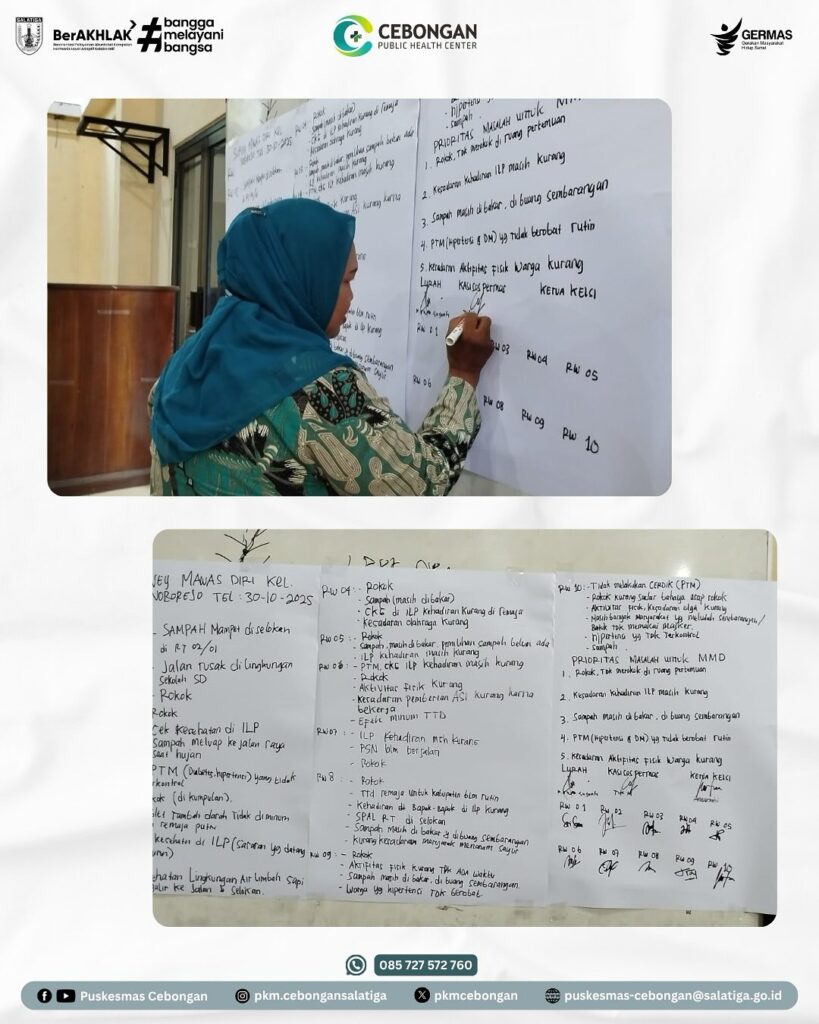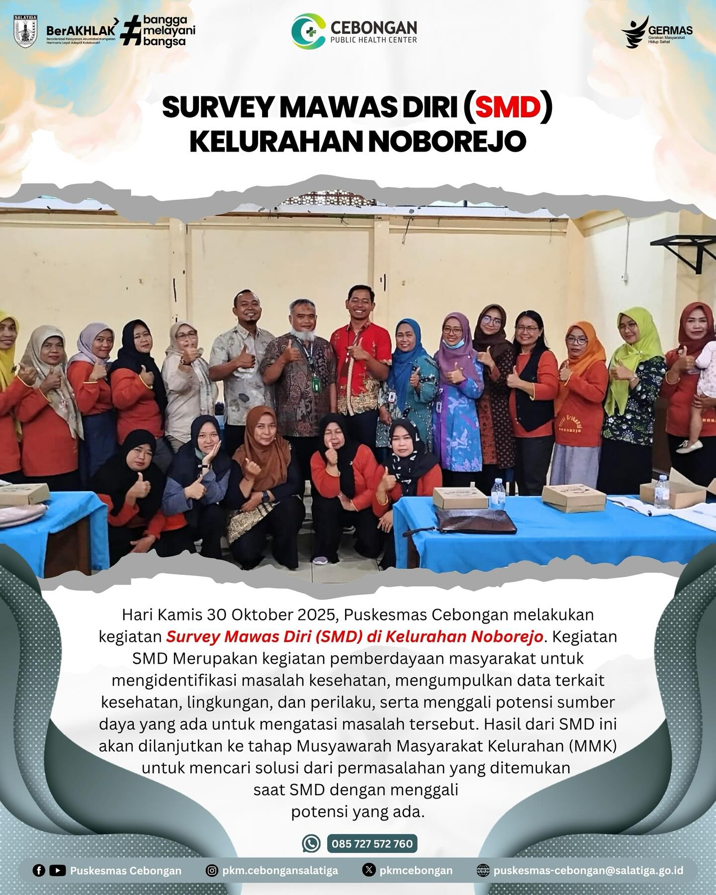 Hari Kamis 30 Oktober 2025, Puskesmas Cebongan melakukan kegiatan Survey Mawas Diri (SMD) di Kelurahan Noborejo. Kegiatan SMD Merupakan kegiatan pemberdayaan masyarakat untuk mengidentifikasi masalah kesehatan, mengumpulkan data terkait kesehatan, lingkungan, dan perilaku, serta menggali potensi sumber daya yang ada untuk mengatasi masalah tersebut. Hasil dari SMD ini akan dilanjutkan ke tahap Musyawarah Masyarakat Kelurahan (MMK) untuk mencari solusi dari permasalahan yang ditemukan saat SMD dengan menggali potensi yang ada.
