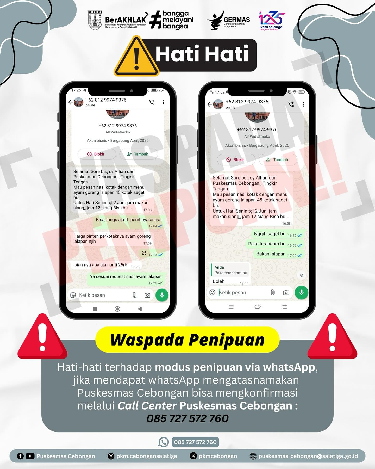 Hati-hati terhadap modus penipuan via whatsApp, jika mendapat whatsApp mengatasnamakan Puskesmas Cebongan bisa mengkonfirmasi melalui Call Center Puskesmas Cebongan : 085 727 572 760 Terimakasih. Navigasi pos Kelas ibu balita kelurahan LedokPengukuran kebugaran lansia dan CKG